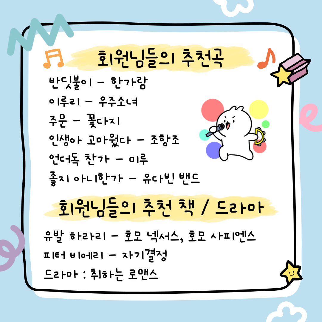 ȸ¿ø´ÔµéÀÇ Ãßõ ³ë·¡, Ã¥, µå¶ó¸¶ µî ´Ù¾çÇÑ Ãßõ ¸®½ºÆ®µéÀ» ¹Þ¾Æ º¼ ¼ö ÀÖ¾ú´Âµ¥¿ä.