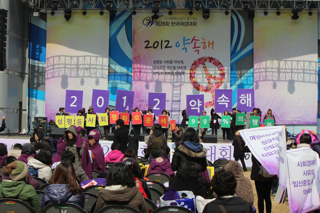 ¿ÃÇØ ¼¿ï¿¡¼ ÁøÇàµÈ ¼¼°è¿©¼ºÀÇ ³¯ ±â³ä Çѱ¹¿©¼º´ëȸÀÇ ÁøÇàÀº ¿©¼º¿¬ÇÕÈ«º¸´ë»ç ¹è¿ì ±ÇÇØÈ¿¾¾¿Í Çѱ¹¿©¼º´Üü¿¬ÇÕ ±è±Ý¿Á °øµ¿´ëÇ¥°¡ ¸Ã¾ÒÀ¸¸ç Àü±¹¿¡¼ ¸ðÀΠȰµ¿°¡µé°ú ¸¹Àº ½Ã¹ÎµéÀÌ º¸¶ó»ö ¿Ê, ½ºÄ«ÇÁ µîÀ» Âø¿ëÇÏ°í ¡¯2012 ¾à¼ÓÇØ¡®¸¦ ¿ÜÄ¡¸ç Çà»ç°¡ ½ÃÀ۵Ǿú´Ù. À̳¯ Çà»ç Áß ¹Ú¿ø¼ø½ÃÀå, ÇѸí¼÷´ëÇ¥ µîÀº Ãà»ç¸¦ ÅëÇØ ¡°¼¿ï½Ã°¡ ¿©¼ºÆòµî ÇØ¹æÀÇ Áø¿øÁö°¡ µÉ °ÍÀ» ¾à¼ÓÇÑ´Ù. ½Ã¹ÎÀÌ, ±×¸®°í ¿©¼ºÀÌ, ÁÖÀÎ µÇ´Â »çȸ¸¦ ¸¸µé °Í¡±, ¡°³²³àÀÇ Á¤Ä¡Â÷º°À» ¾ø¾Ö°í ´õºÒ¾î »ç´Â »çȸ¸¦ À§ÇØ ÇÔ²² ÀüÁøÇÏÀÚ¡±¸ç ¼ºÆòµîÀ» ÁöÁöÇÏ´Â ¶æÀ» ¹àÇû´Ù. ƯÈ÷ ¿ÃÇØÀÇ ¿©¼º¿îµ¿»óÀº Ư¼ö°í¿ë³ëµ¿Á÷ÀÇ ºÎ´çÇÑ Çö½ÇÀ» ¾Ë¸®°í »çȸÀû °ø°¨´ë¸¦ Çü¼ºÇÏ¿´À¸¸ç, 2012³â 3¿ù ÇöÀç±îÁö Çýȵ¿ º»»ç ¿·¿¡ ³ó¼º õ¸·À» Ä¡°í 1,540Àϰ ³ó¼ºÀ» Áö¼ÓÇØ¿À°í ÀÖ´Â Àç´É±³À°ÁöºÎ°¡ ¼±Á¤µÇ¾ú´Ù. °è¼ÓµÈ ³ó¼º Áß¿¡ ¾Ï¿¡ °É·Á »ç¸ÁÇÑ ¿©¼º³ëµ¿ÀÚÀÇ À̾߱⸦ µéÀ» ¶§´Â ¿ïÄÀÇÑ ¸¶À½¿¡ ´«¹°À» ÈÉÄ¡±âµµ ÇÏ¿´´Ù. À̾î 3.8¼¼°è¿©¼ºÀÇ ³¯ ±â³ä ¿©¼º¼±¾ð°ú ÆÛÆ÷¸Õ½º°¡ ÁøÇàµÇ¾úÀ¸¸ç 2012 ¾à¼ÓÇØ!¸¦ ¿ÜÄ¡¸ç 20°³ÀÇ ½½·Î°ÇÀ» ¹ßÇ¥Çß´Ù. 20°³ÀÇ ½½·Î°Ç Áß Æ¯È÷ ³ª¿¡°Ô ÀÇ¹Ì ÀÖ¾ú´ø ½½·Î°ÇÀº ¡°»çȸ°æÁ¦Àû »çÀ¯ÀÇ ÀÓ½ÅÁßÀýÀ» Çã¿ëÇϵµ·Ï ¸ðÀÚº¸°Ç¹ýÀ» °³Á¤Ç϶ó! ¿©¼ºÆø·Â±ÙÀý ¹× ÇÇÇØÀÚÁö¿øÃ¼°è¸¦ Àü¸é °³ÆíÇ϶ó! ¼º¸Å¸Å¾Ë¼±¾÷ÀÚ¿¡ ´ëÇÑ Ã³¹ú °È ¹× ¼º¸Å¸Å¿©¼ºÀ» ºñ¹üÁËÈÇ϶ó! ÃÊ․Áß․°í±³¿¡ ÅëÇÕÀû ÀαDZ³À°À» Àǹ«ÈÇ϶ó! ¿Ã¹Ù¸¥ Â÷º°±ÝÁö¹ýÀ» Á¦Á¤Ç϶ó!¡± ¿´´Ù. ±×°£ÀÇ È°µ¿ ¼Ó¿¡¼ ƯÈ÷ Áß¿äÇÏ´Ù°í ü°¨Çß´ø ³»¿ëµéÀ» ´ÙÇÔ²² ÈûÀ» ¸ð¾Æ ¿ÜÄ¡´Â °úÁ¤¿¡¼ ÈûÀÌ ¼Ú´Â ´À³¦À̾ú´Ù.