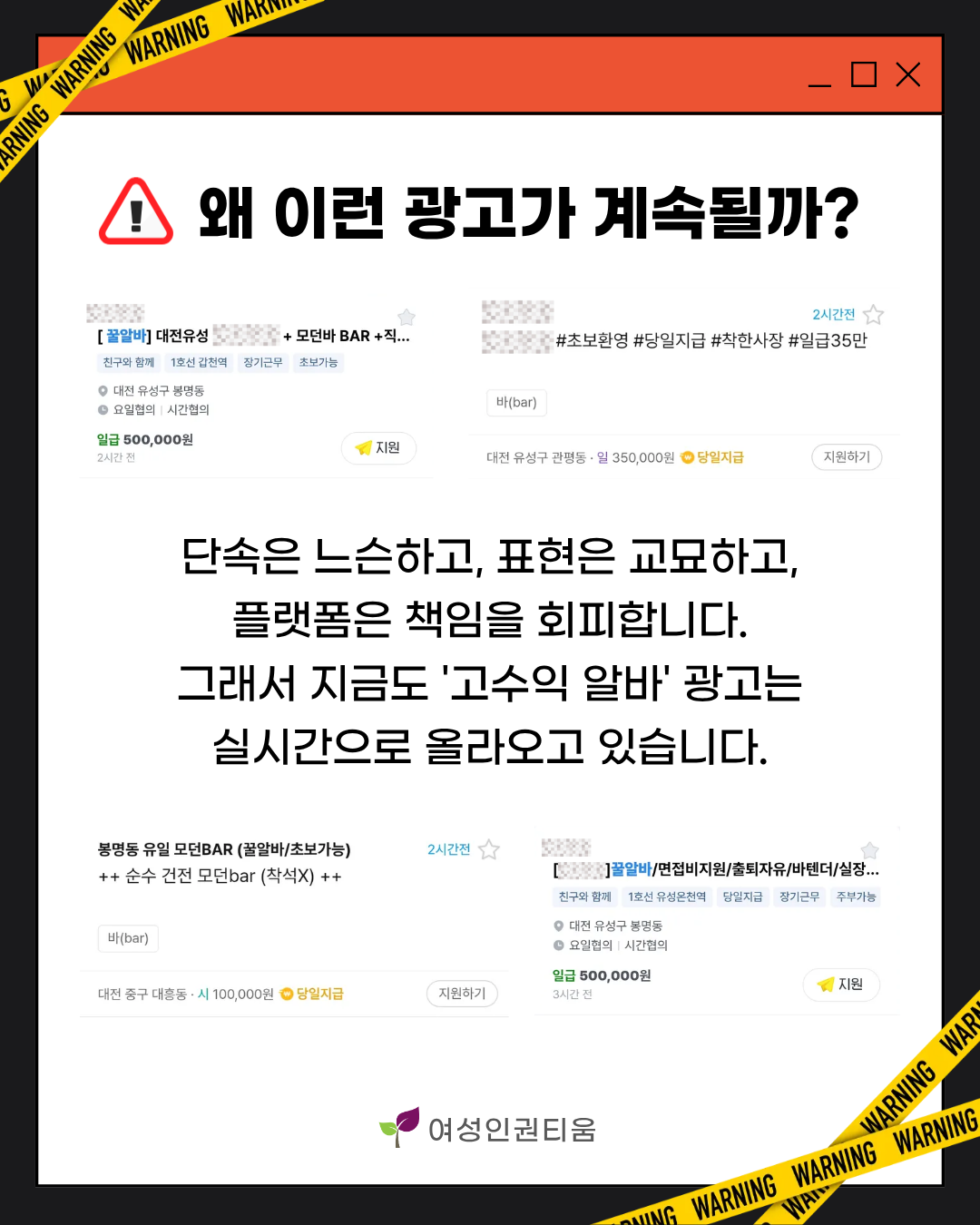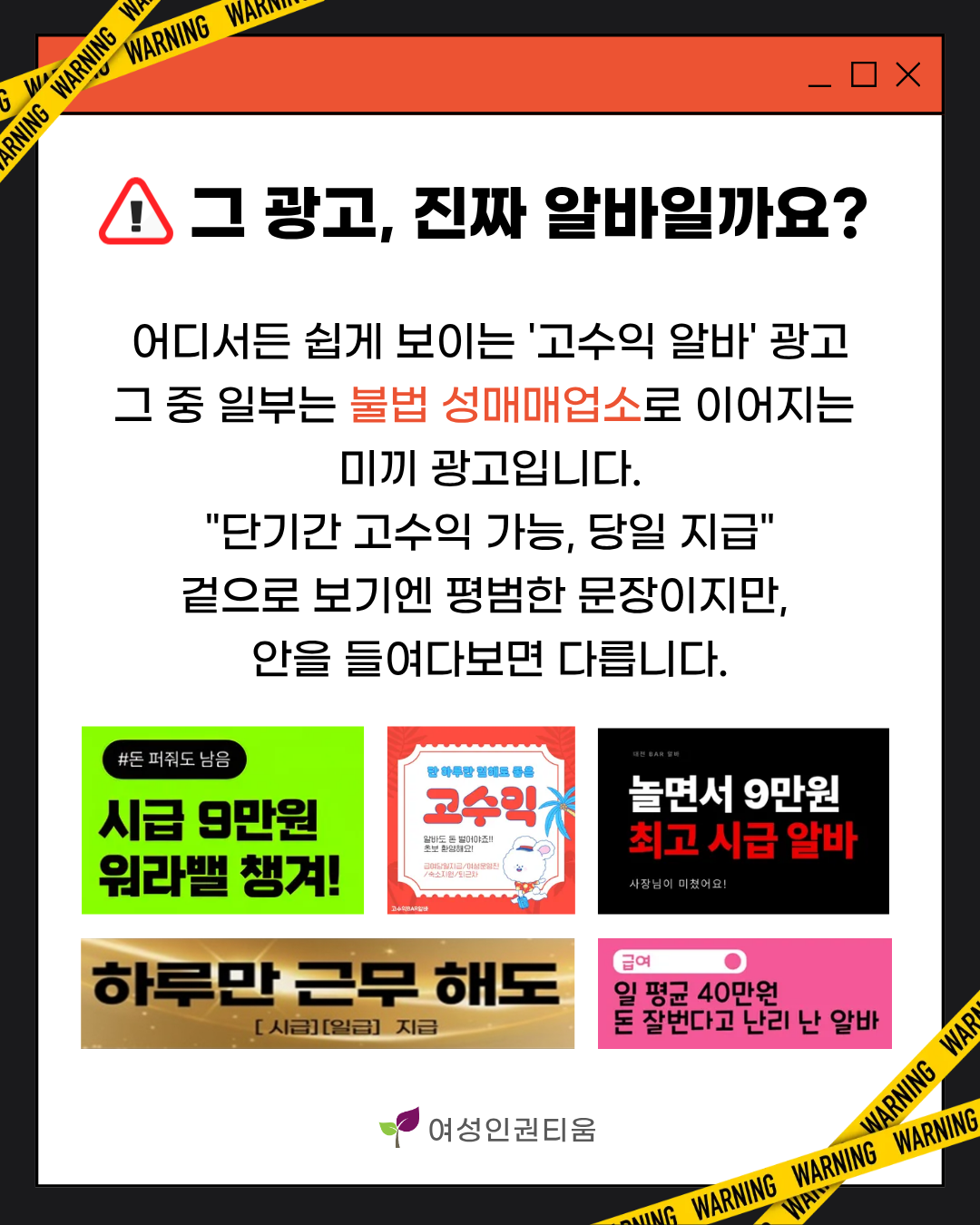 SNS¿Í ±¸ÀÎ »çÀÌÆ®¿¡ ÈçÇÑ '´Ü±â°£ °í¼öÀÍ' ±¤°í´Â °ÑÀ¸·Î´Â Æò¹üÇØ º¸ÀÌÁö¸¸, ºÒ¹ý ¼º¸Å¸Å ¾÷¼Ò·Î À̾îÁö´Â À§ÇèÇÑ Åë·ÎÀÔ´Ï´Ù. ÀÌ·¯ÇÑ ±¤°í´Â ¼º¸Å¸Å ó¹ú¹ý À§¹ÝÀÌÀÚ ¼º ÂøÃë ¾Ë¼±ÀÇ ¼ö´ÜÀÔ´Ï´Ù.