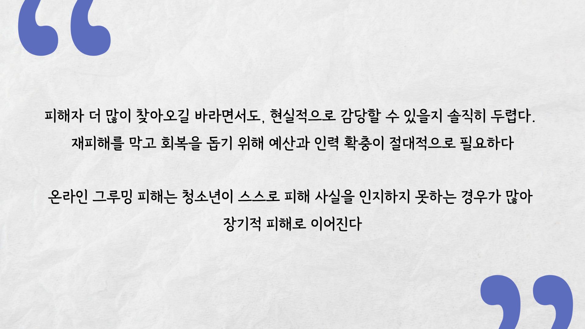 ¹ßÁ¦¿¡¼­´Â ´ëÀüÁö¿ª ¼ºÂøÃëÇÇÇØ¾Æµ¿¡¤Ã»¼Ò³â Áö¿ø Ȱµ¿ ÇöȲ°ú ÇÔ²², À§±âû¼Ò³â ÀÚ¸³Áö¿ø»ç¾÷ÀÇ ¼º°ú¿Í ÇѰ谡 °øÀ¯µÇ¾ú½À´Ï´Ù. ÇöÀå °æÇèÀ» ¹ÙÅÁÀ¸·Î ÇÑ ¹ßÁ¦´Â ¼ºÂøÃë ÇÇÇØ ÀÌÈÄÀÇ È¸º¹°ú ÀÚ¸³ÀÌ ´ÜÀýµÇÁö ¾Ê±â À§Çؼ­´Â »ý°è, ÀÇ·á, ¹ý·ü, ½É¸®, ÀÚ¸³Áö¿øÀÌ À¯±âÀûÀ¸·Î ¿¬°áµÇ´Â ÅëÇÕÀû Áö¿øÃ¼°è°¡ ÇÊ¿äÇÏ´Ù´Â Á¡À» °­Á¶Çß½À´Ï´Ù.