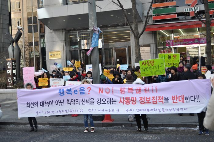 2011³â 2¿ù11ÀÏ 12½Ã ¿©¼º°¡Á·ºÎ¾Õ¿¡¼ Æø·ÂÇÇÇØ¿©¼ºÀÇ °³ÀÎÁ¤º¸ÁýÀûÀ» ¹Ý´ëÇÏ´Â Áýȸ¸¦ ÁøÇàÇÏ¿´´Ù.