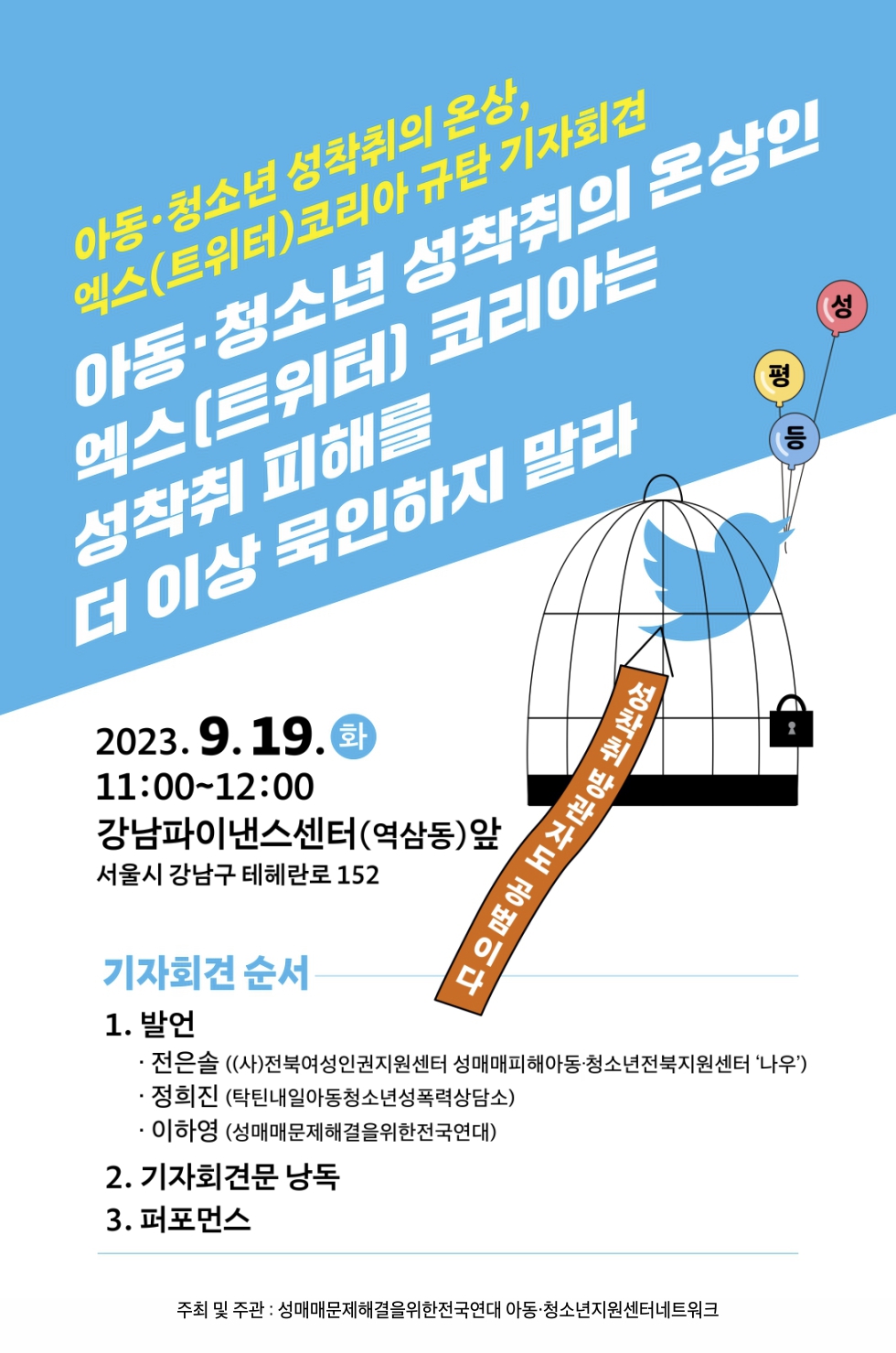 'Ç¥ÇöÀÇ ÀÚÀ¯'¶ó´Â ¹Ì¸í ¾Æ·¡, ¹üÁËÀÇ ¸Å°³°¡ µÇ´Â ¿¢½º(Æ®À§ÅÍ)ÀÇ ¹æ°üÀ» ±ÔźÇϱâ À§ÇÑ À̹ø ±âÀÚȸ°ß¿¡´Â ¼º¸Å¸Å¹®Á¦ÇذáÀ»À§ÇÑÀü±¹¿¬´ë, Àü±¹¼º¸Å¸ÅÇÇÇØ¾Æµ¿Ã»¼Ò³âÁö¿ø³×Æ®¿öÅ©, Źƾ³»ÀÏ, ´Ù½ÃÇÔ²²»ó´ã¼¾ÅÍ, Ãáõ ±æÀâÀÌÀÇ Áý, Çѱ¹»çÀ̹ö¼ºÆø·Â´ëÀÀ¼¾ÅͰ¡ ¿¬´ëÇÏ¿© 100¿©¸íÀÇ ÇöÀå´Üü ½Ç¹«ÀÚµéÀÌ Âü¿©ÇÏ¿© ÇÔ²² ¸ñ¼Ò¸®¸¦ ³Â½À´Ï´Ù.