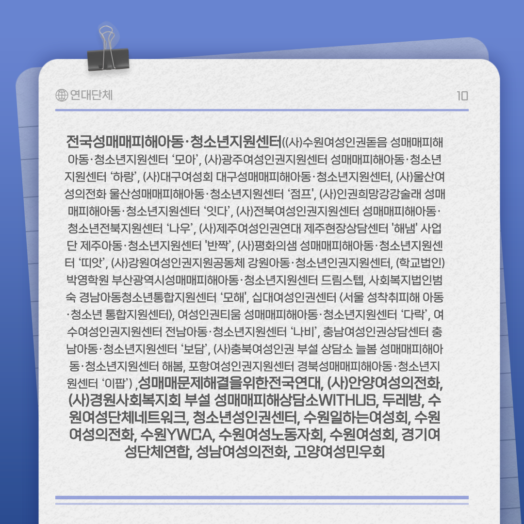 Àü±¹ ¼º¸Å¸ÅÇÇÇØ¾Æµ¿¡¤Ã»¼Ò³âÁö¿ø¼¾ÅÍ(¼ö¿ø¿©¼ºÀαǵ¸À½ ¼º¸Å¸ÅÇÇÇØ¾Æµ¿¡¤Ã»¼Ò³âÁö¿ø¼¾ÅÍ ¡®¸ð¾Æ¡¯,(»ç)±¤ÁÖ¿©¼ºÀαÇÁö¿ø¼¾ÅÍ ¼º¸Å¸ÅÇÇÇØ¾Æµ¿¡¤Ã»¼Ò³âÁö¿ø¼¾ÅÍ ¡®Ç϶û¡¯, (»ç)´ë±¸¿©¼ºÈ¸ ´ë±¸¼º¸Å¸ÅÇÇÇØ¾Æµ¿¡¤Ã»¼Ò³âÁö¿ø¼¾ÅÍ, (»ç)¿ï»ê¿©¼ºÀÇÀüÈ­ ¿ï»ê¼º¸Å¸ÅÇÇÇØ¾Æµ¿¡¤Ã»¼Ò³âÁö¿ø¼¾ÅÍ ¡®Á¡ÇÁ', (»ç)ÀαÇÈñ¸Á°­°­¼ú·¡ ¼º¸Å¸ÅÇÇÇØ¾Æµ¿¡¤Ã»¼Ò³âÁö¿ø¼¾ÅÍ ¡®ÀÕ´Ù¡¯, (»ç)ÀüºÏ¿©¼ºÀαÇÁö¿ø¼¾ÅÍ ¼º¸Å¸ÅÇÇÇØ¾Æµ¿¡¤Ã»¼Ò³âÀüºÏÁö¿ø¼¾ÅÍ ¡®³ª¿ì¡¯, (»ç)Á¦ÁÖ¿©¼ºÀαǿ¬´ë Á¦ÁÖÇöÀå»ó´ã¼¾ÅÍ 'ÇØ³¿' »ç¾÷´Ü Á¦Á־Ƶ¿¡¤Ã»¼Ò³âÁö¿ø¼¾ÅÍ '¹Ý¦¡¯, (»ç)ÆòÈ­ÀÇ»ù ¼º¸Å¸ÅÇÇÇØ¾Æµ¿¡¤Ã»¼Ò³âÁö¿ø¼¾ÅÍ ¡®¶ì¾Ñ¡¯, (»ç)°­¿ø¿©¼ºÀαÇÁö¿ø°øµ¿Ã¼ °­¿ø¾Æµ¿¡¤Ã»¼Ò³âÀαÇÁö¿ø¼¾ÅÍ, (Çб³¹ýÀÎ) ¹Ú¿µÇпø ºÎ»ê±¤¿ª½Ã¼º¸Å¸ÅÇÇÇØ¾Æµ¿¡¤Ã»¼Ò³âÁö¿ø¼¾ÅÍ µå¸²½ºÅÜ, »çȸº¹Áö¹ýÀιü¼÷ °æ³²¾Æµ¿Ã»¼Ò³âÅëÇÕÁö¿ø¼¾ÅÍ ¡®¸ðÇØ', ½Ê´ë¿©¼ºÀαǼ¾ÅÍ <¼­¿ï ¼ºÂøÃëÇÇÇØ ¾Æµ¿¡¤Ã»¼Ò³â ÅëÇÕÁö¿ø¼¾ÅÍ>, ¿©¼ºÀÎ±ÇÆ¼¿ò ¼º¸Å¸ÅÇÇÇØ¾Æµ¿¡¤Ã»¼Ò³âÁö¿ø¼¾ÅÍ ¡®´Ù¶ô¡¯, ¿©¼ö¿©¼ºÀαÇÁö¿ø¼¾ÅÍ Àü³²¾Æµ¿¡¤Ã»¼Ò³âÁö¿ø¼¾ÅÍ ¡®³ªºñ¡¯, Ãæ³²¿©¼ºÀαǻó´ã¼¾ÅÍ Ãæ³²¾Æµ¿¡¤Ã»¼Ò³âÁö¿ø¼¾ÅÍ ¡®º¸´ã¡¯, (»ç)ÃæºÏ¿©¼ºÀ뱂 ºÎ¼³ »ó´ã¼Ò ´Ãº½ ¼º¸Å¸ÅÇÇÇØ¾Æµ¿¡¤Ã»¼Ò³âÁö¿ø¼¾ÅÍ ÇØº½, Æ÷Ç׿©¼ºÀαÇÁö¿ø¼¾ÅÍ °æºÏ¼º¸Å¸ÅÇÇÇØ¾Æµ¿¡¤Ã»¼Ò³âÁö¿ø¼¾ÅÍ ¡®ÀÌÆË¡¯) ,¼º¸Å¸Å¹®Á¦ÇذáÀ»À§ÇÑÀü±¹¿¬´ë, (»ç)¾È¾ç¿©¼ºÀÇÀüÈ­, (»ç)°æ¿ø»çȸº¹Áöȸ ºÎ¼³ ¼º¸Å¸ÅÇÇÇØ»ó´ã¼ÒWITHUS, µÎ·¹¹æ, ¼ö¿ø¿©¼º´Üü ³×Æ®¿öÅ©, û¼Ò³â¼ºÀαǼ¾ÅÍ, ¼ö¿øÀÏÇϴ¿©¼ºÈ¸, ¼ö¿ø¿©¼ºÀÇÀüÈ­, ¼ö¿øYWCA, ¼ö¿ø¿©¼º³ëµ¿ÀÚȸ, ¼ö¿ø¿©¼ºÈ¸, °æ±â¿©¼º´Üü¿¬ÇÕ, ¼º³²¿©¼ºÀÇÀüÈ­, °í¾ç¿©¼º¹Î¿ìȸ