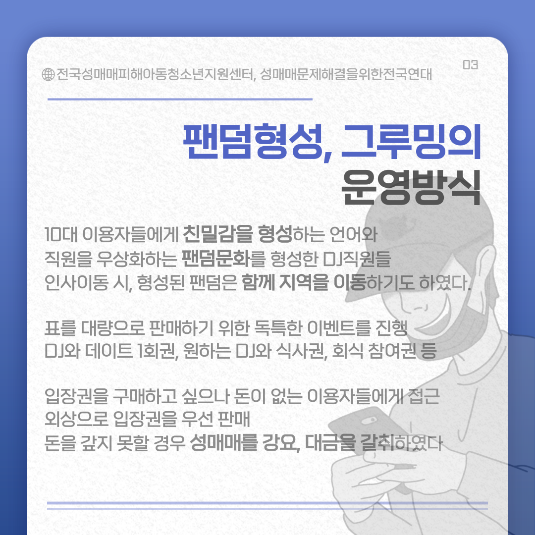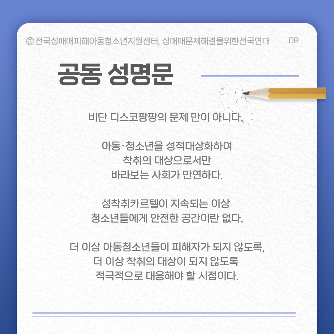 2023³â 7¿ù 10ÀÏ ¾Æµ¿Ã»¼Ò³â ´ë»óÀ¸·Î ¼ö¿ø¿ª µð½ºÄÚÆÎÆÎ Á÷¿øµéÀÇ ¼º¸Å¸Å °­¿ä ¹× Çù¹Ú¼ºÆøÇà µîÀÇ ÇøÀǷΠ±¸¼ÓµÇ¾ú´Ù´Â »ç½ÇÀÌ µå·¯³µ´Ù±×¸®°í 8¿ù ÃÊ ±× ¹üÇàÀÇ ¹èÈÄ¿¡ ÀÖ´ø Àü±¹ ¸ÅÀå ÃѰý ¾÷ÁÖ°¡ üÆ÷µÇ¾ú´Ù¼ö¿øÀ» Æ÷ÇÔÇÑ 22°÷ µð½ºÄÚÆÎÆÎ ½ÇÅÂÁ¶»ç¸¦ ÇÑ °á°úƼÄϱ¸¸Å¸¦ °­¿äÇϰųª ¼ºÈñ·Õ, ½ºÅ²½±À» ÇÏ´Â °æ¿ì°¡ 44%¿¡ ´ÞÇÏ¿´´Ù¶ÇÇÑ ¾ð·Ðº¸µµ ÀÌÈÄ Àá½Ã ¿µ¾÷À» Áß´ÜÇÏ¿´À¸³ª ¾î¶°ÇÑ ´ëÃ¥ÀÌ ¸¶·ÃµÇÁö ¾ÊÀº ä ´« °¡¸®°í ¾Æ¿õÇÏ´Â ¹æ½ÄÀ¸·Î ¿µ¾÷À» Àç°³ÇÑ °÷µµ ÀÖ¾ú´Ù. ºñ´Ü µð½ºÄÚÆÎÆÎÀÇ ¹®Á¦ ¸¸ÀÌ ¾Æ´Ï´Ù¾Æµ¿¡¤Ã»¼Ò³âÀ» ¼ºÀû´ë»óÈ­ÇÏ¿© ÂøÃëÀÇ ´ë»óÀ¸·Î¼­¸¸ ¹Ù¶óº¸´Â »çȸ°¡ ¸¸¿¬ÇÏ´Ù. ¼ºÂøÃëÄ«¸£ÅÚÀÌ Áö¼ÓµÇ´Â ÀÌ»ó Ã»¼Ò³âµé¿¡°Ô ¾ÈÀüÇÑ °ø°£À̶õ ¾ø´Ù.  ´õ ÀÌ»ó ¾Æµ¿Ã»¼Ò³âµéÀÌ ÇÇÇØÀÚ°¡ µÇÁö ¾Êµµ·Ï´õ ÀÌ»ó ÂøÃëÀÇ ´ë»óÀÌ µÇÁö ¾Êµµ·Ï Àû±ØÀûÀ¸·Î ´ëÀÀÇØ¾ß ÇÒ ½ÃÁ¡ÀÌ´Ù.